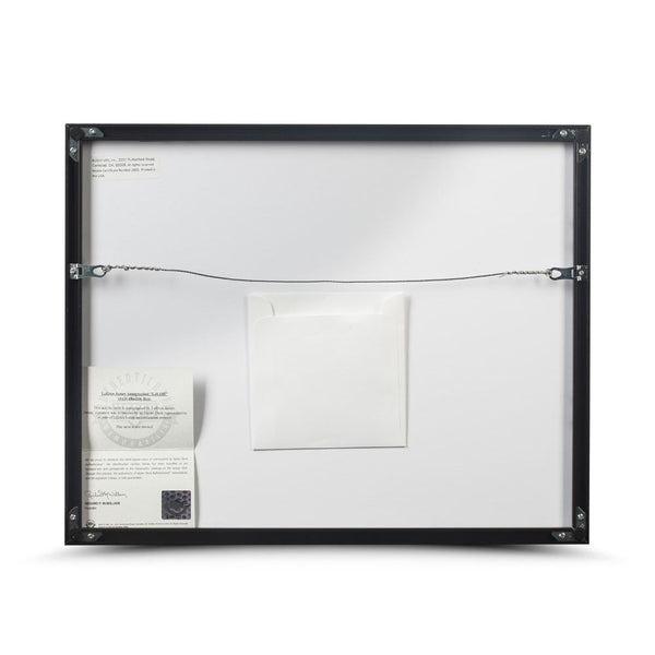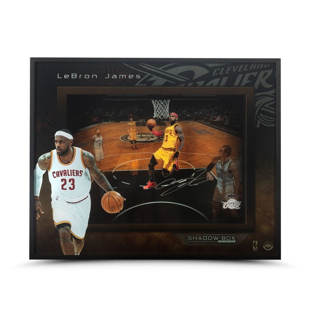 When Upper Deck released Upper Deck SPx Football in the fall of 2009, card collectors were introduced to the first ever Shadow Box card. These innovative three dimensional trading cards were an enormous hit within the card industry. Like any successful invention, the competition quickly followed suit and began adding this technology to their product releases. Upper Deck Authenticated has taken the 2.5" x 3.5" trading card technology and transformed it into a 16" x 20" piece of wall memorabilia. "Lift Off" is the first three dimensional signature Shadow Box of LeBron James. The outer acrylic layer features James in his home white jersey as he looks to make a play. The middle signed layer exhibits James flying in the air towards the rim, while the back layer contains the Barclays Center and players watching in awe of James. This multi layered shadow box contains images on each layer with the all-important signature housed on the middle clear acrylic sheet. LeBron James has signed his name in silver paint pen. The layers of the shadow box are housed in a black metal frame making the overall framed dimension "20.5 x 2.5 x 16.5". The 3-D Shadow Box Collection by Upper Deck Authenticated is sure to be fan favorites and the topic of conversation when viewed for the first time. James' signature was witnessed under UDA's Five-Step Authentication Process.
