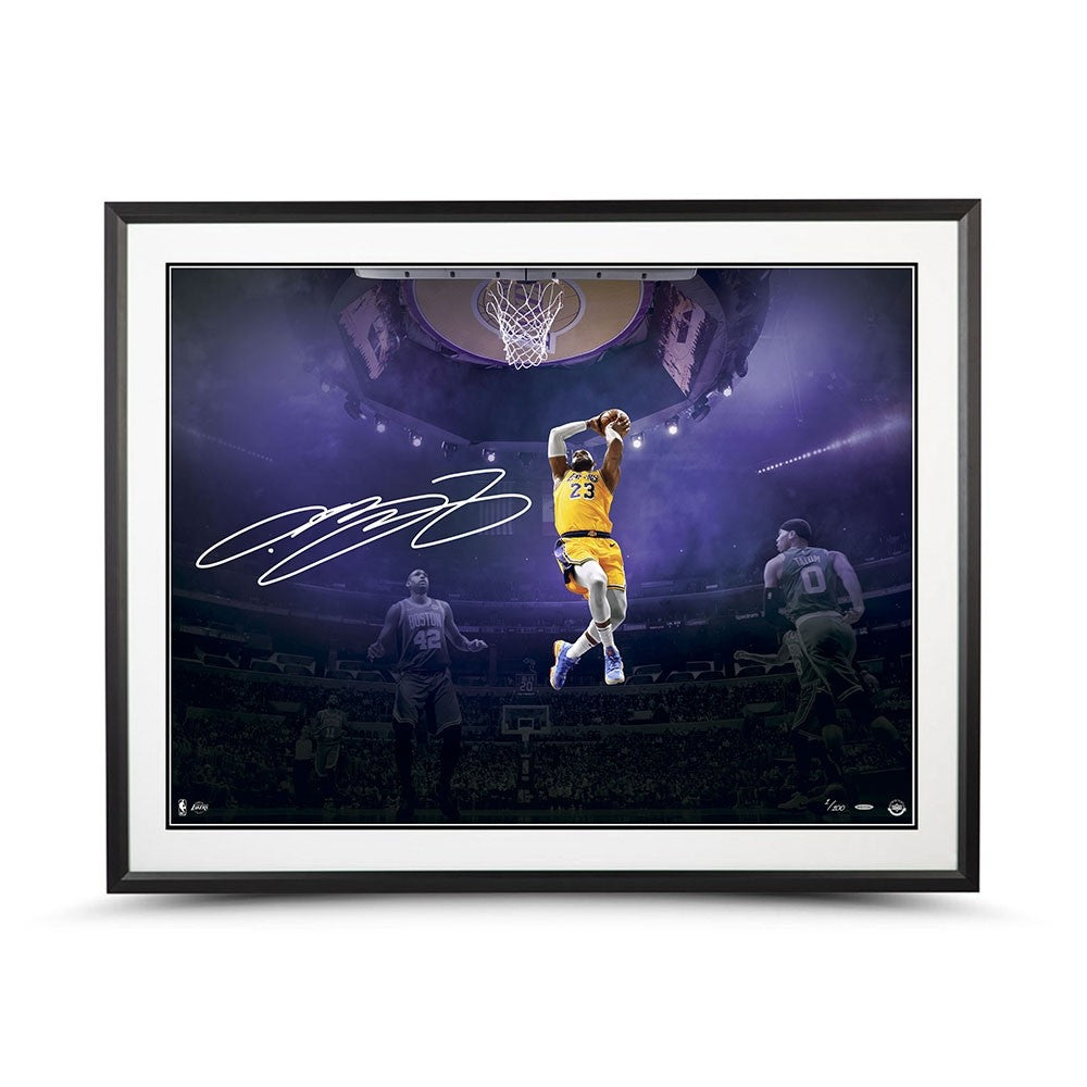 It’s serendipitous in more ways than one that LeBron James joined the Lakers as the third team in his career. Tops on the list are two things: 1.) he joined the organization that owns 16 championships as one of the most storied teams in all of sports, and 2.) he has had some outstanding moments in his career against the Lakers’ greatest rival, the Boston Celtics. Perhaps the most memorable moment in his career vs. the Celtics came in the 2012 Eastern Conference Finals Game 6. With the Heat facing elimination, he scored 45 points to send the series back to Miami for Game 7. LeBron and the Heat would win Game 7 and he would go on to win his first career NBA Finals championship. Not to be outdone was his effort in Game 7 of the 2018 Eastern Conference Finals in which he scored 35 points and came within one assist of a triple-double in another elimination game victory. In short, James plays some of his most inspired basketball against the classic Celtics. Now he gets to have those moments as a member of the Los Angeles Lakers. This image showcases James flying to the basket to finish a power jam against the Lakers’ storied rival, the Celtics. The game captured in this photo was played at Staples Center in Los Angeles on 3/9/19. The image is double-matted and framed for a true finished piece. James has autographed this framed limited edition (100) “On This Occasion” 40” x 30” designed image in silver paint pen. His signature is deemed authentic by virtue of Upper Deck Authenticated’s Five-Step Process.