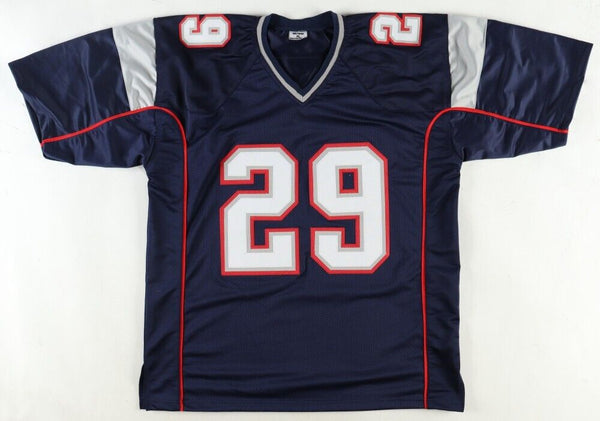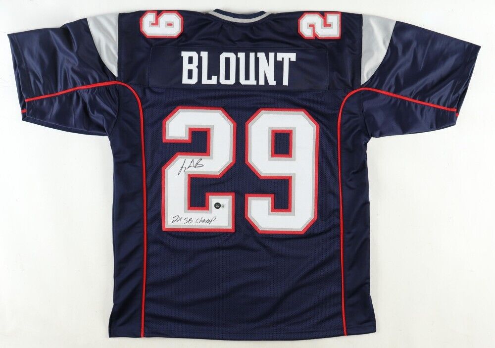 Custom on-field style jersey. Everything is sewn on, size XL. Hand-signed in black felt-tip pen by LaGarrette Blount (New England Patriots). The autograph includes an official Beckett Authentication Services serially numbered hologram and QR Code Card for authenticity purposes. The signing of this item was witnessed by Beckett.Authentication: Beckett Hologram with QR Code Card