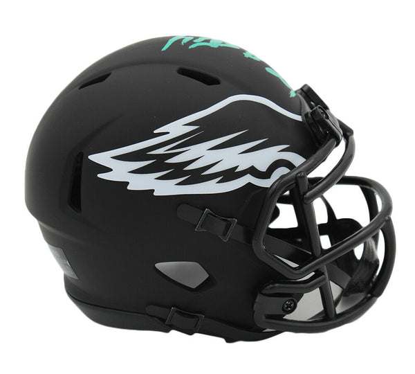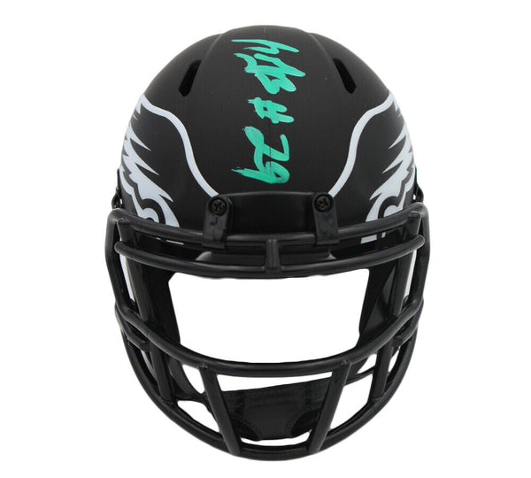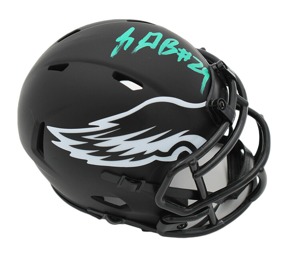 A Philadelphia Eagles Speed Eclipse NFL Mini Helmet hand signed by LeGarrette Blount. The item and signature are in excellent condition. LeGarrette is a former running back who played in the NFL for nine seasons. Blount rushed for over 1,000 yards in each of his two seasons in junior college. He then committed to the Oregon Ducks football program as a junior, for the 2008 season. That year, he ran for over 1,000 yards and scored a school-record 17 touchdowns. He entered the NFL as an undrafted free agent with the Tennessee Titans in 2010, but joined the Tampa Bay Buccaneers before the start of the 2010 NFL season. He also played for the Pittsburgh Steelers in 2014, between his two stints with the New England Patriots, followed by the Philadelphia Eagles in 2017 and the Detroit Lions in 2018. AUTHENTICATION: The item is accompanied by a Certificate of Authenticity - Serial Numbered and Databased Hologram - Picture of LeGarrette from the signing