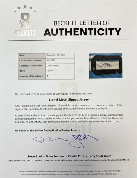 Featured is a Lionel Messi signed Argentina Adidas soccer jersey. This jersey has been hand signed by Messi and comes with the Beckett hologram and letter of authenticity. This jersey is size L. Please note: there is a small stain on left shoulder on back of jersey. This jersey would make a great addition to any sports memorabilia collection!. SPECIFICATIONS Autographed By: Lionel Messi Team: Barcelona Sport: Soccer Authentication: Beckett Grading Services