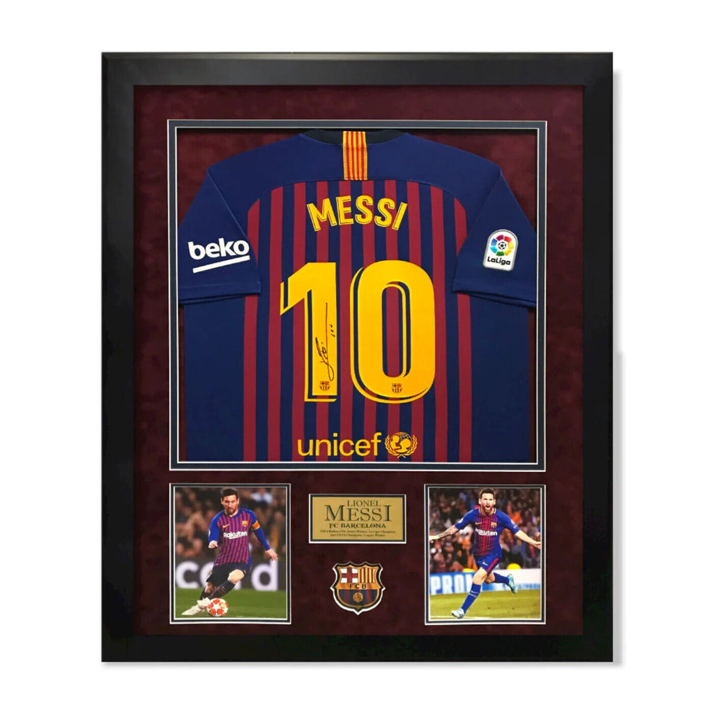This Barcelona jersey custom framed to 32x40 has been personally hand signed by Lionel Messi 100% Authentic Certificate of authenticity by Icons exact location of signature may vary asgmemorabilia.com