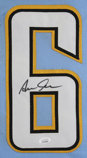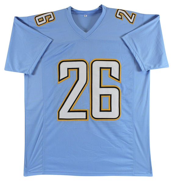 This Autographed Powder Blue Pro Style Jersey has been Personally Signed by Asante Samuel Jr. of the Los Angeles Chargers. This item is 100% Authentic to include a Certificate of Authenticity (COA) / hologram by JSA Witness. This is a JSA Witnessed Protection Program item which means a JSA representative was present when this item was being signed. We conducted an autograph signing with Asante Samuel Jr. where multiples of the same item were signed. While the photographs are representative of this item, the size, placement and strength of the signature may vary. Each item is hand signed, therefore, each autograph is unique. This item can be verified through JSA Witness. This is a X-Large sized, non-branded, custom-stitched Jersey.