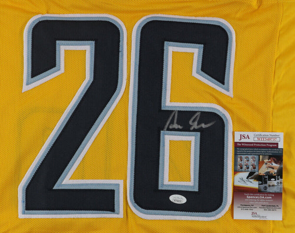 Custom on-field style jersey. Everything is sewn on, size XL. Hand-signed in black felt-tip pen by Asante Samuel. The lot / autograph(s) includes an official James Spence Authentication (JSA) hologram and matching COA for authenticity purposes. The signing of this item was witnessed by JSA. Also includes a proof photo from the sigining. Authentication: JSA COA