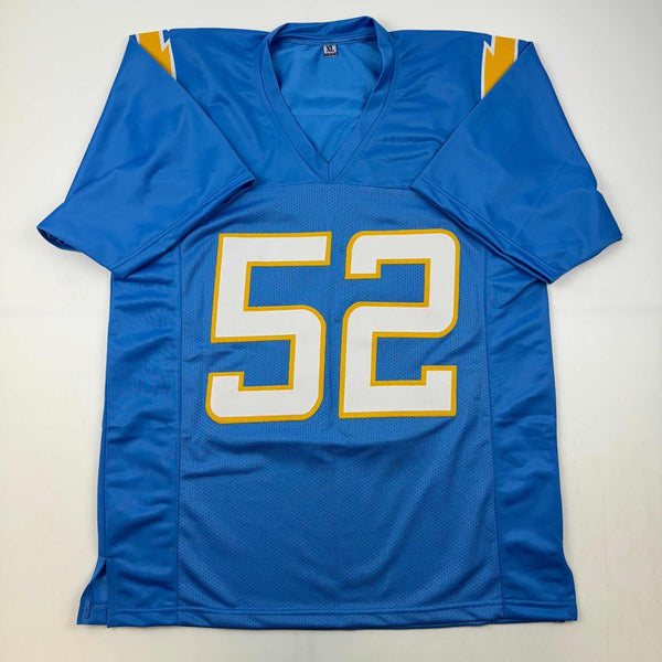 Autographed/Signed Khalil Mack LA Light Blue Football Jersey Beckett BAS COA Jersey has no brand names or logos. This is a custom jersey and was not manufactured by or in any manner associated with any professional sports league or manufacturer. This custom jersey carries no professional sports league designation. The item is intended to be an autographed collectible. The custom jersey displays the name and number of the player. This item in no way is affiliated with or connected to any professional sports organization. Size is XL.