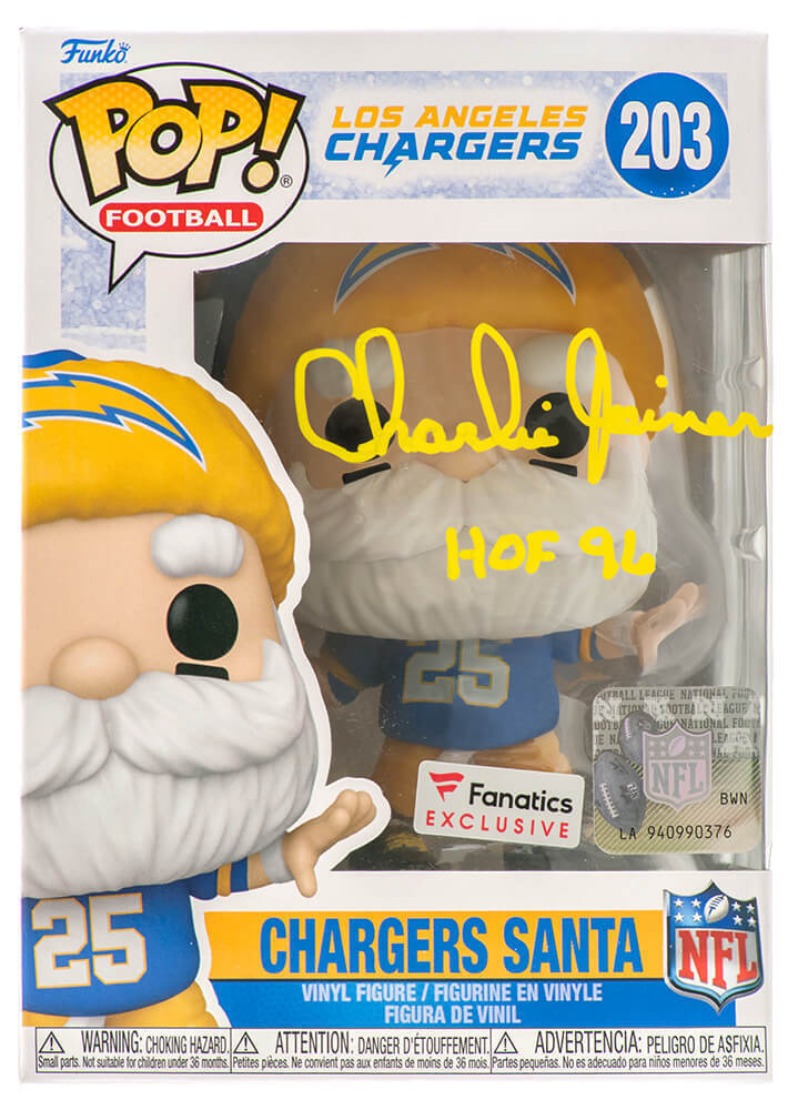 Charlie Joiner signed Los Angeles Chargers 'SANTA' Funko Pop doll #203 with 'HOF 96' inscription. Item comes with a Schwartz Sports Memorabilia tamper-proof numbered hologram and Certificate of Authenticity which can be verified online.