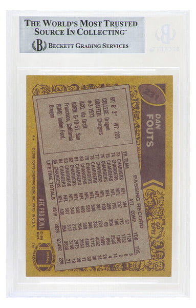 Dan Fouts signed Chargers 1986 Topps football trading card #231. The card has been authenticated and encapsulated by Beckett Authentic and the authentication number can be verified online.