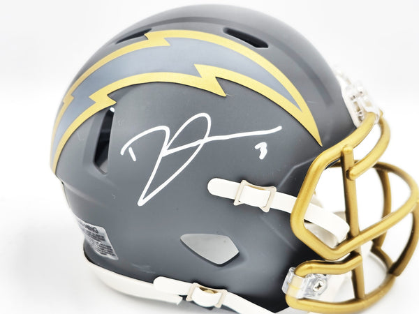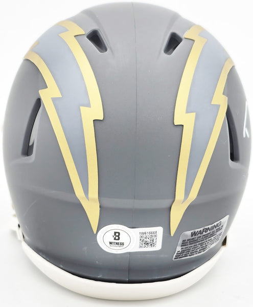 This is a Los Angeles Chargers Slate Gray Speed Mini Helmet that has been hand signed by Derwin James Jr. This item has been witnessed and certified authentic by Beckett Authentication (BAS) and comes with their tamper-proof witness sticker.