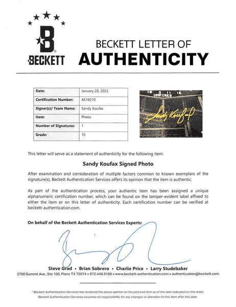This Autographed Auto Graded Gem Mint 10! 16x20 Photo has been Personally Signed by Sandy Koufax of the Los Angeles Dodgers. This item is 100% Authentic to include a Certificate of Authenticity (COA) / hologram by Beckett Authentication Services. The authenticity can be verified on Beckett Authentication Services website.