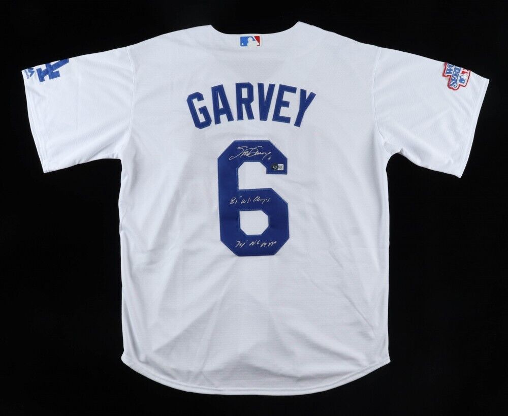 Mitchell & Ness jersey with everything sewn on, size adult Large. Hand-signed and inscribed by Steve Garvey. Please note, there is slight staining on the front of the jersey. See photos regarding the condition of the item.The autograph includes an official Beckett Authentication Services serially numbered hologram and QR Code card for authenticity purposes. The signing of this item was witnessed by Beckett.Authentication: Beckett Hologram with QR Code card