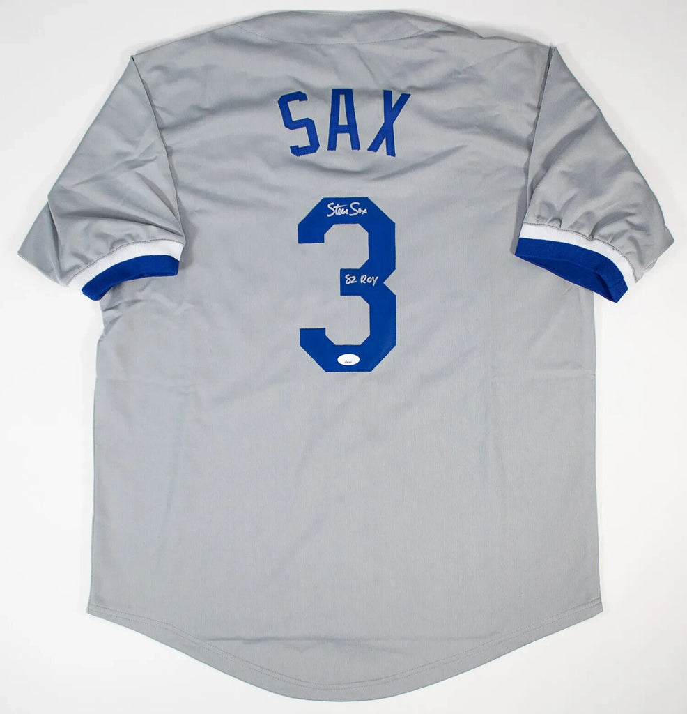 This autographed custom on-field style adult XL jersey has been personally hand-signed by Steve Sax of the Los Angeles Dodgers. When signing, Sax inscribed "82 ROY" along with his signature. This autograph is certified by James Spence Authentication (JSA). It comes with the numbered hologram and matching Certificate of Authenticity.Custom on-field style jerseys are a more affordable option for autograph seekers. These jerseys do not have any brand name or tags and are made in the Philippines. They feature stitched on names and numbers and are made to look very similar to the on-field jerseys that the players wear. These custom jerseys are very commonly used in the memorabilia industry.