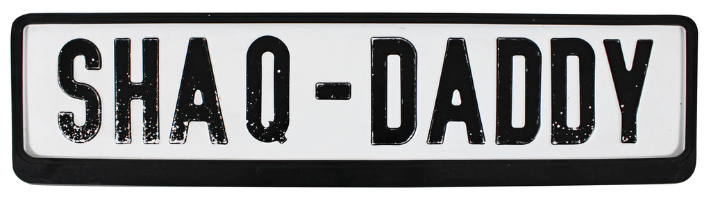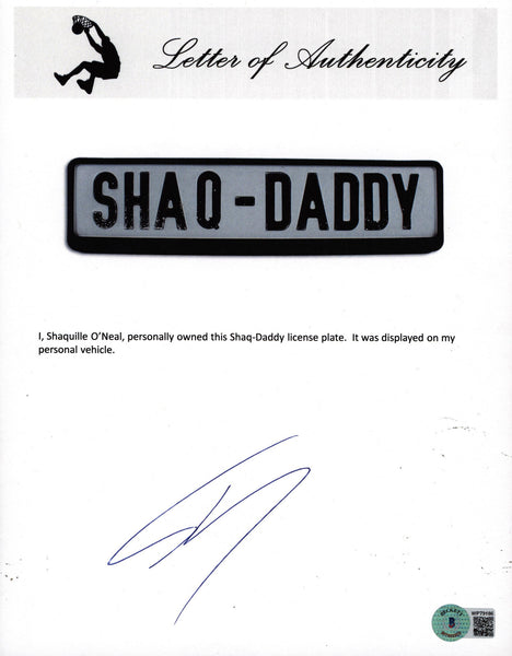 This Shaq-Daddy License Plate has been Personally used by Shaquille O'Neal. This license plate measures approximately 21 x 5 inches. This license plate will come with a Letter of Provenance from Shaquille O'Neal. The signature on the Letter of Provenance was signed and witnessed by a Beckett representative.
