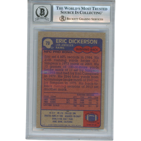 The number in the listing title is just an inventory sku for our records and is not the authentication number. The item pictured is a stock photo. There are multiple quantities of this item. Each of these items is unique because they are individually hand-signed. While the photographs accurately represent the item itself, please note that the signature's size, exact placement, and strength may differ on the one you receive. This is a Los Angeles Rams 1985 Topps #79 Slabbed Trading Card that was personally autographed by Eric Dickerson. Includes a certificate of authenticity / hologram from Beckett Authentication Services (BAS) and Denver Autographs. FREE SHIPPING within the USA on orders over $10!