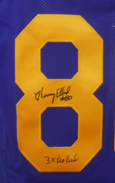 Henry Ellard Autographed Los Angeles Rams XL Blue Jersey 3x Pro Bowl 19285 This is a custom size XL blue jersey with sewn on name and numbersthat has been personally signed by Henry Ellard with 3x Pro Bowl inscription.This jerseyincludes a certificate of authenticity from Denver Autographs.