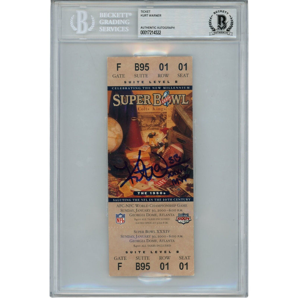 The number in the listing title is just an inventory sku for our records and is not the authentication number. The item pictured is the exact item you will receive, please see photos for condition. This is a Super Bowl XXXIV Ticket Stub that was personally autographed by Kurt Warner includes "SB MVP" inscription. Includes a certificate of authenticity from Beckett Authentication Services (BAS) and Denver Autographs.FREE SHIPPING within the USA on orders over $10!