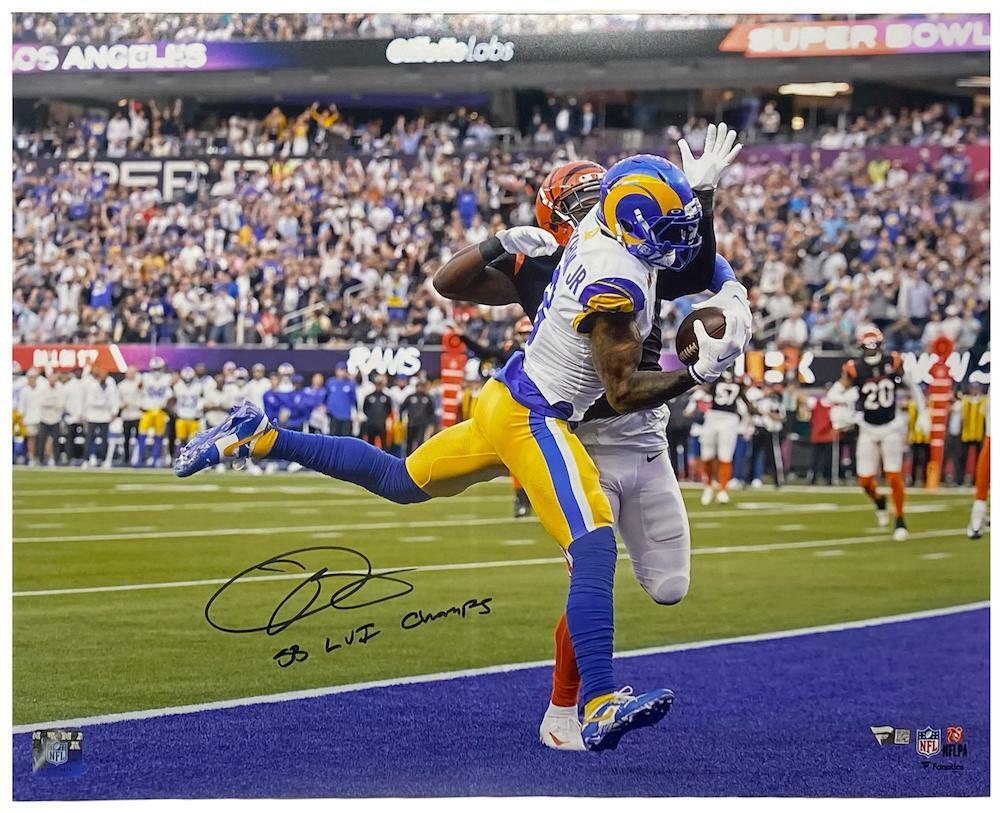This 16" x 20" photograph has been personally hand-signed by odell beckham jr. with the added inscription "sb lvi champs." it is officially licensed by the national football league and comes with an individually numbered, tamper-evident hologram from fanatics authentic. to ensure authenticity, the hologram can be reviewed online. this process helps to ensure that the product purchased is authentic and eliminates any possibility of duplication or fraud.the autograph includes an official fanatics hologram and matching coa for authenticity purposes.comes with a tamper-evident hologram from fanatics authenticatedofficially licensed by the nfl money back guarantee! if for any reason you are not completely satisfied with the quality or authenticity of your purchase, we will gladly give you a full refund or exchange, whichever you prefer up to 30 days after purchase. please feel free to e-mail us with any questions. good luck bidding!!! authenticator pre-certified authenticator: fanatics authenticated history of item: odell beckham jr. has signed this item in the presence of a representative from fanatics. describe how you came to possess this item: super sports center is a fully authorized dealer for upper deck authenticated as well as mounted memories and steiner sports. other information about you and / or the item: super sports center strives to deliver the most authentic in sports memorabilia from trusted companies like mounted memories, steiner sports and upper deck authenticated. if it exists, we can find it for you!