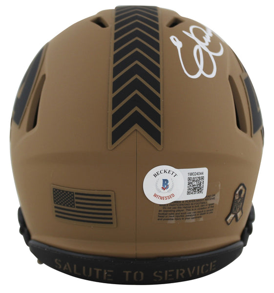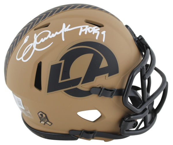 This Autographed Alternate 2023 Salute To Service II Speed Mini Helmet W/ Uv Mirrored Back Acrylic Display Case with the inscription of "HOF 99" has been Personally Signed by Eric Dickerson of the Los Angeles Rams. This item is 100% Authentic to include a hologram by Beckett Authentication Services. This item will come with an affixed Beckett Authentication Services (BAS) authentication sticker, which includes a scannable QR code to verify authenticity. Please note that Beckett no longer provides serial-numbered COA cards, and the attached BAS sticker will serve as the complete authentication for this item. This is a BAS Witnessed Protection Program item which means a Beckett Authentication Service representative was present when this item was being signed. We conducted an autograph signing with Eric Dickerson where multiples of the same item were signed. While the photographs are representative of this item, the size, placement and strength of the signature may vary. Each item is hand signed, therefore, each autograph is unique. This item can be verified through BAS Witnessed.