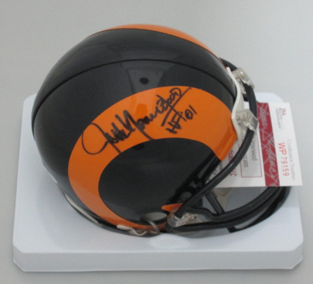 Los Angeles Rams Throwback Mini Helmet hand signed by former Legend Jack Youngblood. The signature is in Black sharpie. Youngblood is a member of the National Football Hall of Fame. This Mini Helmet was signed at a PUBLIC signing and would make a great addition to any Lions collection! This item is guaranteed to be 100% authentic and will include a JSA COA with matching serial numbered sticker.