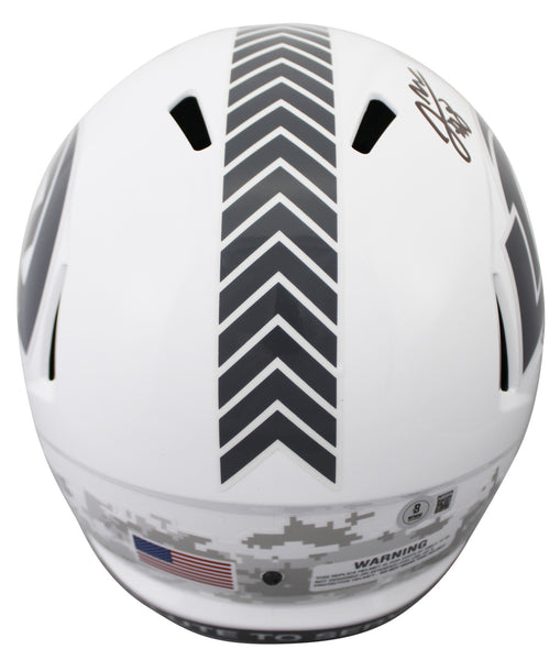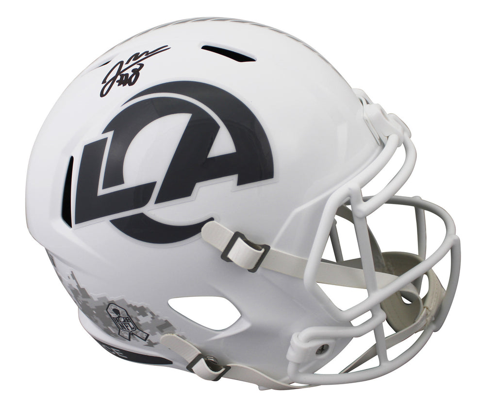 This Autographed Alternate 2024 Salute To Service III Riddell Full Size Speed Rep Helmet has been Personally Signed by Jared Verse of the Los Angeles Rams. This item is 100% Authentic to include a hologram by Beckett Authentication Services. This item will come with an affixed Beckett Authentication Services (BAS) authentication sticker, which includes a scannable QR code to verify authenticity. Please note that Beckett no longer provides serial-numbered COA cards, and the attached BAS sticker will serve as the complete authentication for this item. This is a BAS Witnessed Protection Program item which means a Beckett Authentication Service representative was present when this item was being signed. We conducted an autograph signing with Jared Verse where multiples of the same item were signed. While the photographs are representative of this item, the size, placement and strength of the signature may vary. Each item is hand signed, therefore, each autograph is unique. This item can be verified through BAS Witnessed.