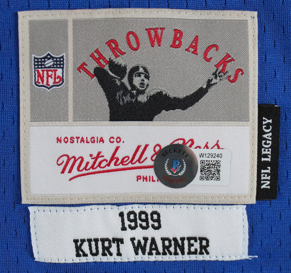 This Autographed Blue Mitchell & Ness Jersey with the inscription of "HOF 17 & SB XXXIV MVP" has been Personally Signed by Kurt Warner of the Los Angeles Rams. This item is 100% Authentic to include a hologram by Beckett Authentication Services. This item may come with the new Beckett Authentication hologram that has a scannable QR code rather than the traditional COA. If you would like to have a COA, you are welcome to reach out to Beckett for a printed certification once you receive your item. This is a BAS Witnessed Protection Program item which means a Beckett Authentication Service representative was present when this item was being signed. We conducted an autograph signing with Kurt Warner where multiples of the same item were signed. While the photographs are representative of this item, the size, placement and strength of the signature may vary. Each item is hand signed, therefore, each autograph is unique. This item can be verified through BAS Witnessed. This is a X-Large sized Jersey.
