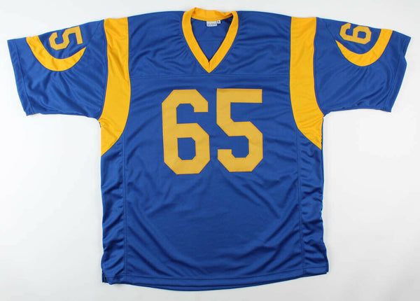 Custom on-field style jersey. Everything sewn on, size XL. Hand-signed and inscribed in black paint pen by Tom Mack. (HOF) The lot / autograph(s) includes an official James Spence Authentication (JSA) hologram and matching COA for authenticity purposes. The signing of this item was witnessed by JSA.Authentication: JSA COA