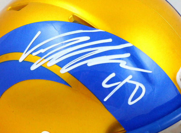 Von Miller Autographed Los Angeles Rams Flash Speed Mini Helmet-Beckett W Hologram *White This is a hand autograph of Von Miller of the Los Angeles Rams on a Riddell Football Flash Speed Mini Helmet. This item has a Beckett Witnessed Authentication, which comes with a numbered hologram and a generic Beckett Certificate of Authenticity. You can view this item on the Beckett website and it shows when and where the item was signed. It was signed either at a public autograph appearance or a private signing. This is a stock photo of the item. Although you may not receive this exact item, the item you receive is virtually identical and brand new in great shape.