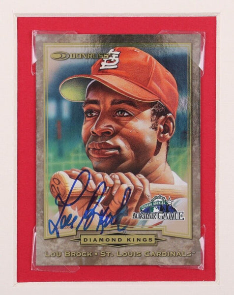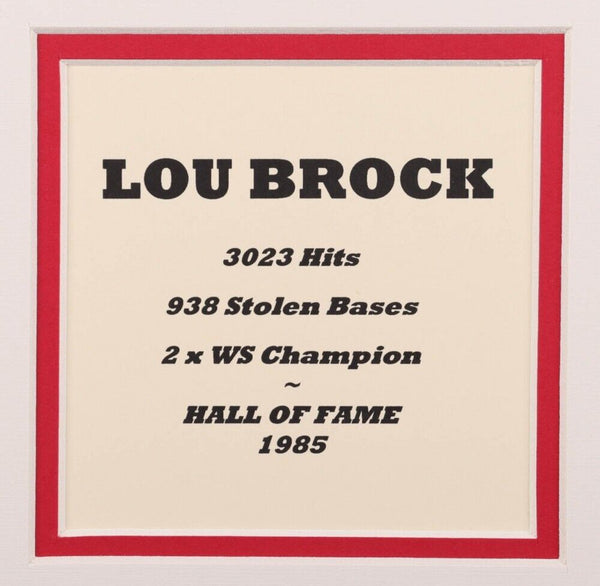 Custom matted display measures 14" x 18" in size and features a 1998 FanFest Brock Fleer card that has been hand-signed by Lou Brock (D. 2020, St. Louis Cardinals, HOF). Please see photos for more details regarding the condition of the display.Brock was best known for his base stealing, and he once held the major league career and single season records for stolen bases. Brock was an All-Star for six seasons and a (NL) stolen base leader for eight seasons. He led the NL in doubles and triples in 1968. He also led the NL in singles in 1972 and was the runner-up for the NL MVP Award in 1974. The lot / autograph(s) includes an official James Spence Authentication (JSA) hologram and matching COA for authenticity purposes.Authentication: JSA COA