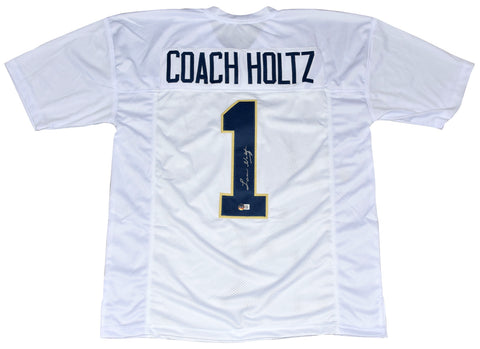 LOU HOLTZ SIGNED AUTOGRAPHED NOTRE DAME IRISH #1 WHITE JERSEY BECKETT