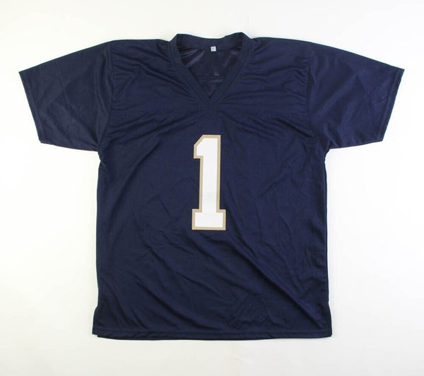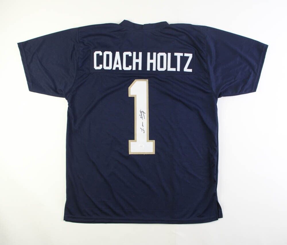 Custom on-field style jersey. Everything is sewn on, size XL. Hand-signed by Lou Holtz.The lot / autograph(s) includes an official James Spence Authentication (JSA) hologram for authenticity purposes. The signing of this item was witnessed by JSA.Authentication: JSA Hologram