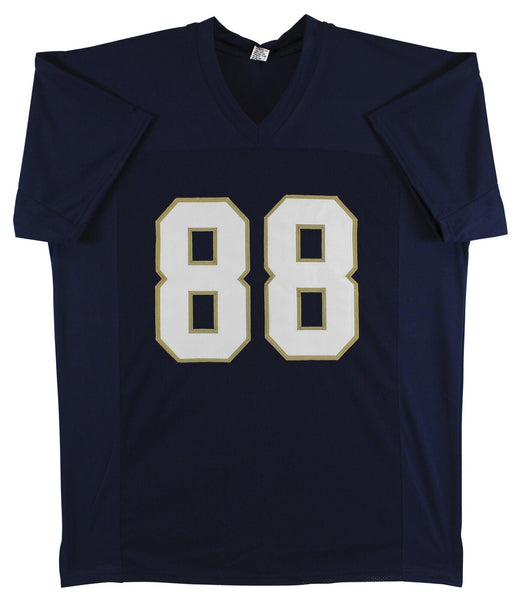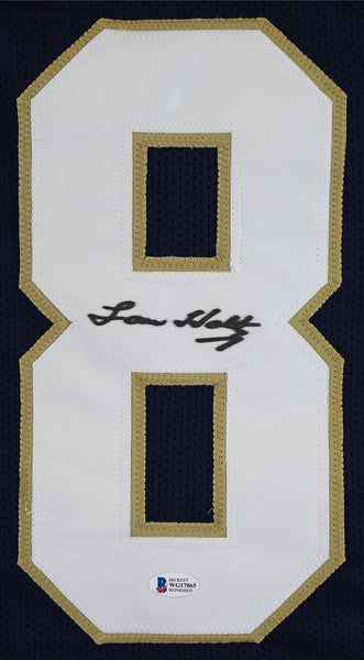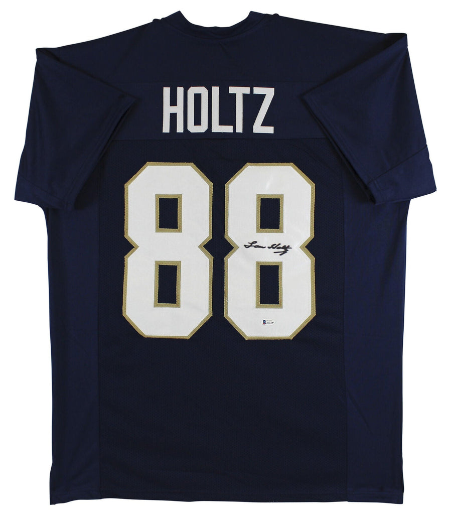 This Autographed Navy Blue Pro Style Jersey has been Personally Signed by Lou Holtz of the Notre Dame Fighting Irish. This item is 100% Authentic to include a hologram by Beckett Authentication Services. This item will come with an affixed Beckett Authentication Services (BAS) authentication sticker, which includes a scannable QR code to verify authenticity. Please note that Beckett no longer provides serial-numbered COA cards, and the attached BAS sticker will serve as the complete authentication for this item. This is a BAS Witnessed Protection Program item which means a Beckett Authentication Service representative was present when this item was being signed. We conducted an autograph signing with Lou Holtz where multiples of the same item were signed. While the photographs are representative of this item, the size, placement and strength of the signature may vary. Each item is hand signed, therefore, each autograph is unique. This item can be verified through BAS Witnessed. This is a X-Large sized, non-branded, custom-stitched Jersey.