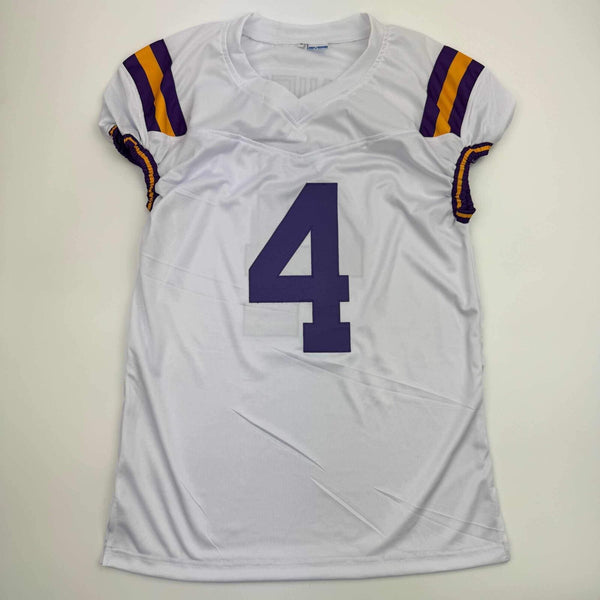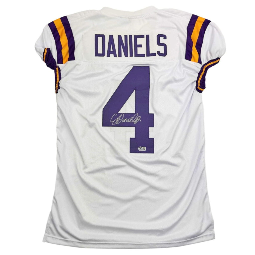 Autographed/Signed CJ C.J. Daniels LSU White College Football Jersey BAS COA Jersey has no brand names or logos. This is a custom jersey and was not manufactured by or in any manner associated with any professional sports league or manufacturer. This custom jersey carries no professional sports league designation. The item is intended to be an autographed collectible. The custom jersey displays the name and number of the player. This item in no way is affiliated with or connected to any professional sports organization. Size is XL.