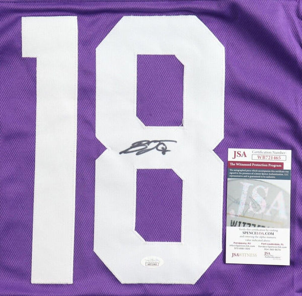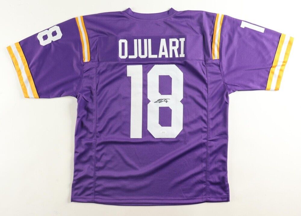 This autographed jersey has been personally hand-signed by BJ Ojulari of the LSU Tigers. This autograph is certified by James Spence Authentication (JSA). It comes with the numbered hologram and matching Certificate of Authenticity.Custom on-field style jerseys are a more affordable option for autograph seekers. These jerseys do not have any brand name or tags and are made in the Philippines. They feature stitched on names and numbers and are made to look very similar to the on-field jerseys that the players wear. These custom jerseys are very commonly used in the memorabilia industry.