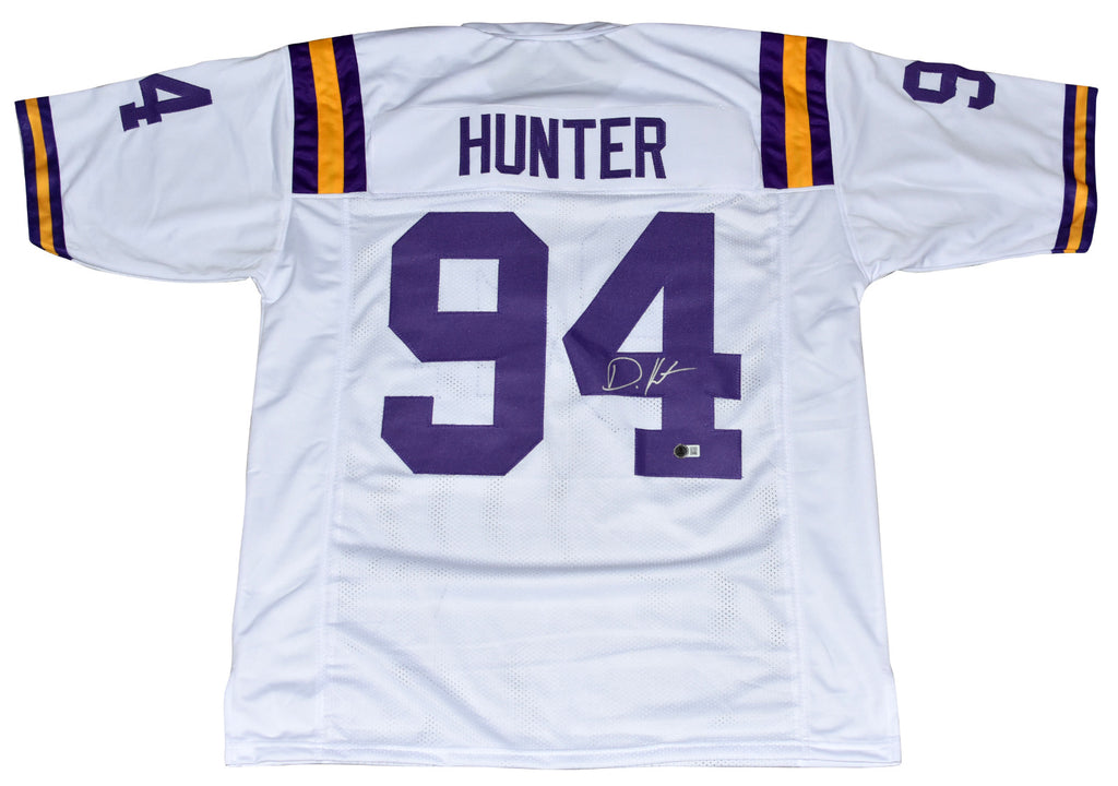 Danielle Hunter, former star defensive end for the LSU Tigers, has hand signed this white custom jersey at a private signing. Jersey is size XL and all letters/numbers are sewn-on. This item is authenticated by Beckett Authentication Services and was signed in the presence of one of their representatives. Their tamper-evident hologram featuring a QR code and serial number is on the item. The authenticity can be verified online by entering the serial number or scanning the QR code.Item pictured may not be the exact item you will receive. It will be similar quality, and we guarantee your satisfaction.
