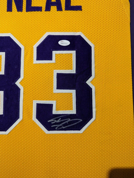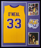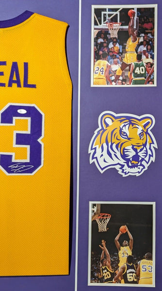 Custom Framed Shaquille O'Neal hand signed LSU Tigers style jersey JSA Hologram and COA The authentication is from JSA. This signature is WITNESSED by a representative of JSA! 100% AUTHENTIC!!! The jersey has fully stitched numbers on the front and back. It is a great item and a must for all great sports fans! This item is professionally framed, it measures 32"x40" inside , 42"x34" outside , using UV protective Acrylic glass for safe keeping and safe transport, team color matting, black moulding and hanging hooks on the back. All additional items in frame seen in pictures included. 100% ready to hang in your fan cave.