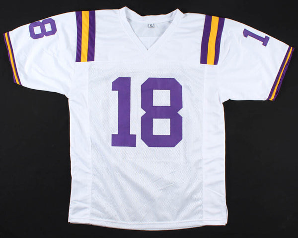 Custom on-field style jersey. Everything is sewn on, size XL. Hand-signed in silver paint pen by K'Lavon Chaisson. The autograph(s) includes an official James Spence Authentication (JSA) "Signature Debut" hologram and COA. "Signature Debut" is the autographed memorabilia equivalent to a rookie card. The JSA definition of a "Signature Debut" is as follows: "Any item that is autographed and received by JSA prior to the last game of the signer's official rookie season.Authentication: JSA Signature Debut COA