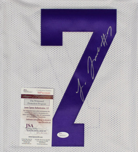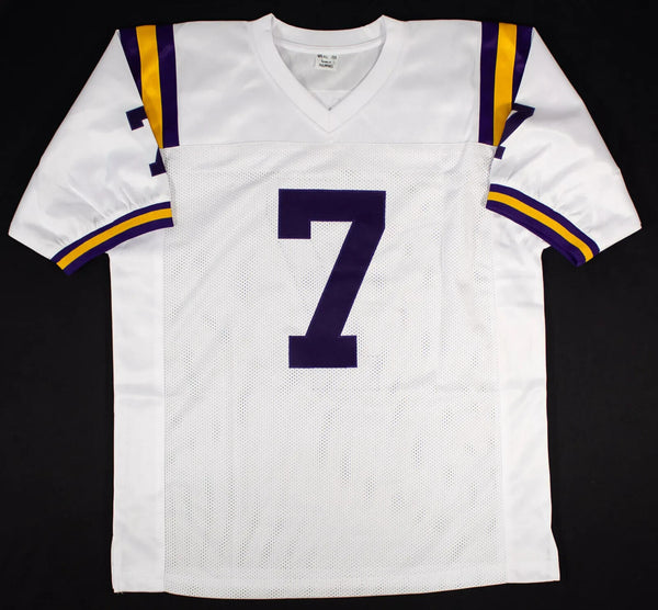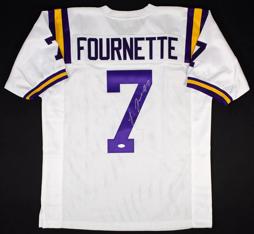 This autographed custom on-field style adult XL jersey has been personally hand-signed by Leonard Fournette of the LSU Tigers.This autograph is certified by James Spence Authentication's (JSA) Witnessed Protection Program. That means that a JSA representative was present when this item was signed. It comes with the numbered hologram and matching Certificate of Authenticity.Custom on-field style jerseys are a more affordable option for autograph seekers. These jerseys do not have any brand name or tags and are made in the Philippines. They feature stitched on names and numbers and are made to look very similar to the on-field jerseys that the players wear. These custom jerseys are very commonly used in the memorabilia industry.