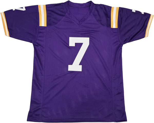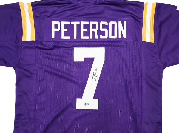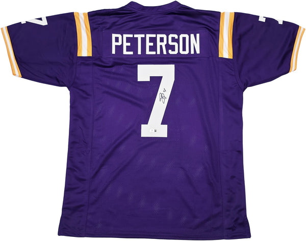 This is a Purple Jersey that has been hand signed by Patrick Peterson. This is a custom jersey with no name brand. The approximate size is XL. It has nice sewn in name and numbers. This item has been witnessed and certified authentic by Beckett Authentication (BAS) and comes with their tamper-proof witness hologram.