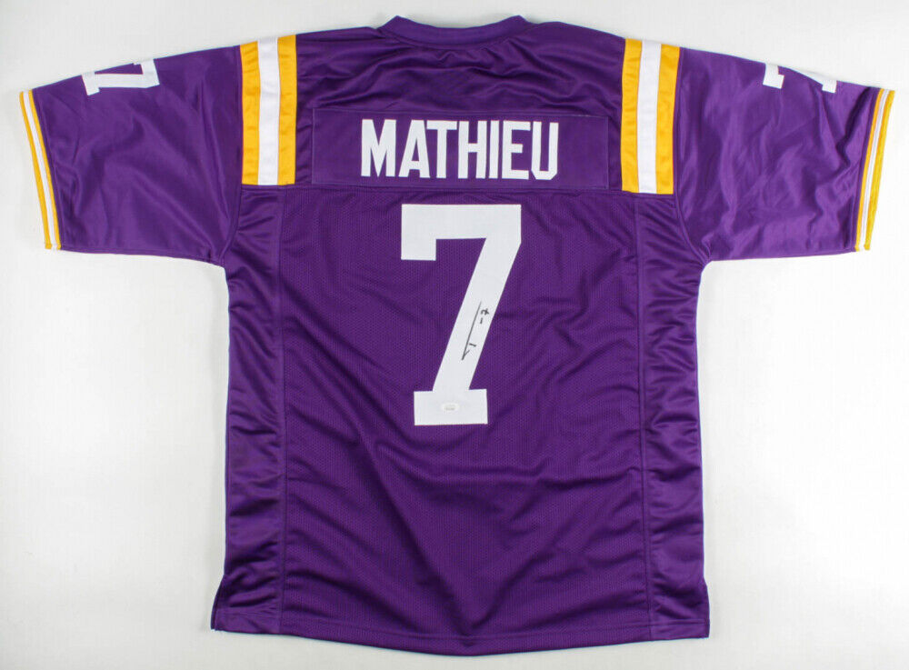 Custom on-field jersey. Everything is sewn on, size XL. Has been hand-signed by Tyrann Mathieu .The lot / autograph(s) includes an official James Spence Authentication (JSA) hologram and QR Code card for authenticity purposes.Authentication: JSA Hologram with Scannable QR Code card