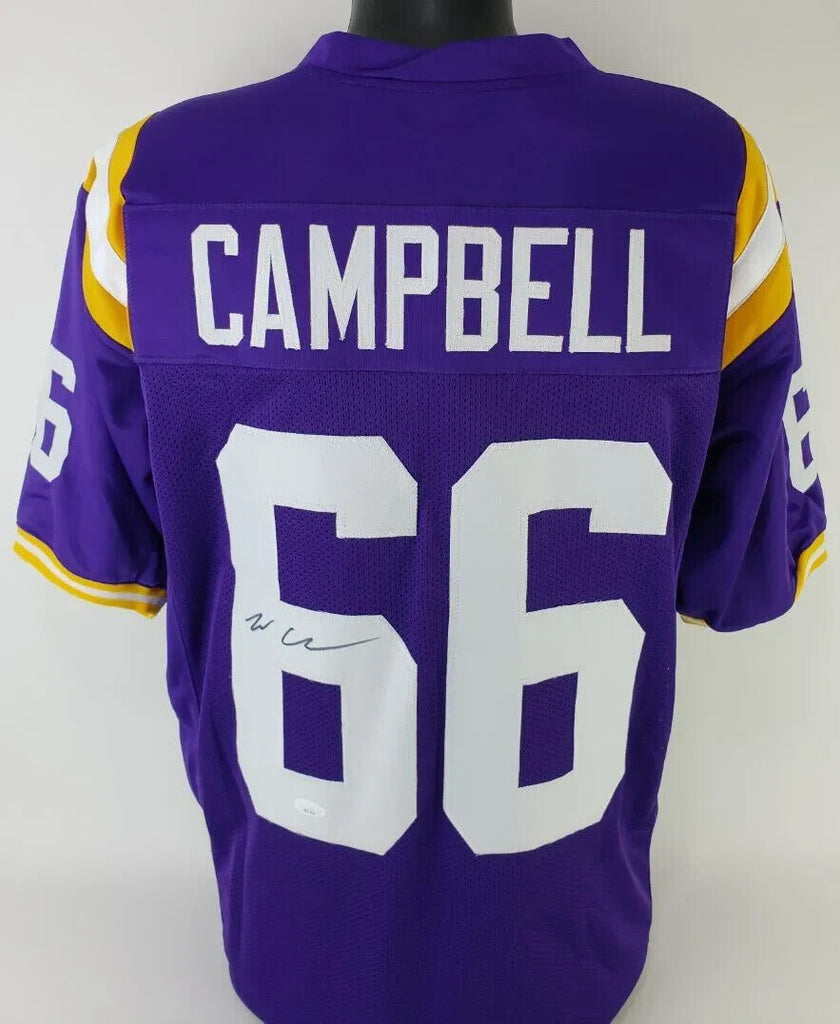 This autographed jersey has been personally hand-signed by Will Campbell of the LSU Tigers.This autograph is certified by James Spence Authentication (JSA). It comes with the numbered hologram and matching Certificate of Authenticity.Custom on-field style jerseys are a more affordable option for autograph seekers. These jerseys do not have any brand name or tags and are made in the Philippines. They feature stitched on names and numbers and are made to look very similar to the on-field jerseys that the players wear. These custom jerseys are very commonly used in the memorabilia industry.