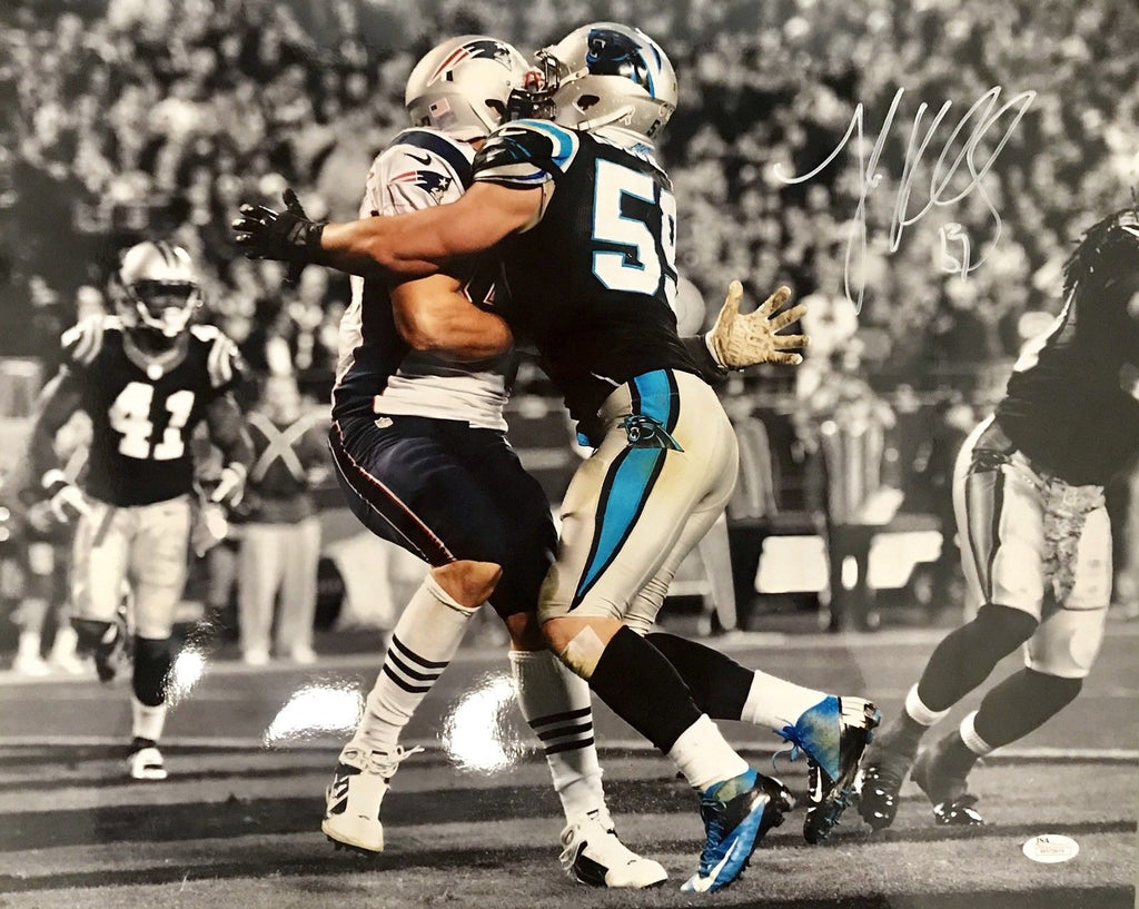 Featured is a Luke Kuechly Signed Carolina Panthers 16x20 Photo. This item was hand-signed by Luke Kuechly and Authenticated by JSA representative. The photo will include a JSA hologram and matching Certificate of Authenticity.