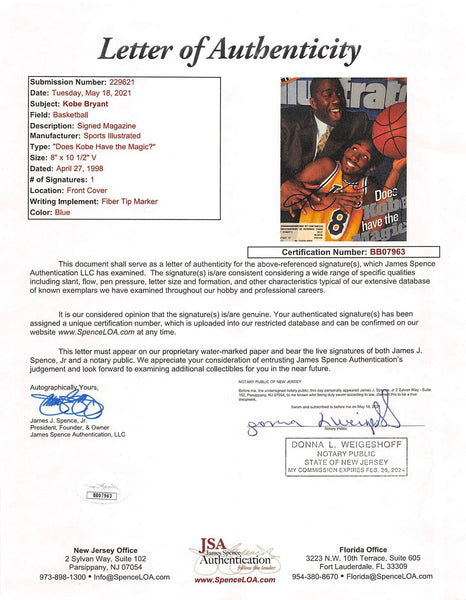 This Autographed Sports Illustrated April 27, 1998 Magazine has been Personally Signed by Kobe Bryant & Magic Johnson of the Los Angeles Lakers. This item is 100% Authentic to include a Certificate of Authenticity (COA) / hologram by JSA. The authenticity can be verified on JSA website.