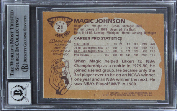 This Autographed Auto 10 1981 Topps #21 Card has been Personally Signed by Magic Johnson of the Los Angeles Lakers. This item is 100% Authentic, it comes slabbed and authenticated by Beckett Authentication Services. The authenticity can be verified on Beckett Authentication Services website.
