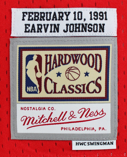This Autographed 1991 Mitchell & Ness Hardwood Classics Red All Star Jersey has been Personally Signed by Magic Johnson of the Los Angeles Lakers. This item is 100% Authentic to include a Certificate of Authenticity (COA) / hologram by Beckett Authentication Services. This is a BAS Witnessed Protection Program item which means a Beckett Authentication Service representative was present when this item was being signed. This is a stock item. We conducted an autograph signing with Magic Johnson and we have several of these available. The one you will receive will be of equal quality to the one pictured. This item can be verified through BAS Witnessed. This is a X-Large sized Jersey.
