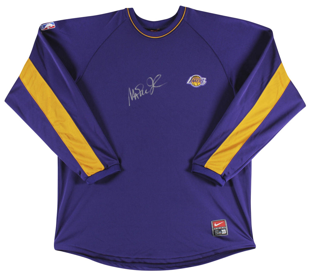 This Autographed Purple Nike Warmup Shirt has been Personally Signed by Magic Johnson of the Los Angeles Lakers. This item is 100% Authentic to include a hologram by Beckett Authentication Services. This item will come with the new Beckett Authentication hologram that has a scannable QR code rather than the traditional COA. If you would like to have a COA, you are welcome to reach out to Beckett for a printed certification once you receive your item. This is a BAS Witnessed Protection Program item which means a Beckett Authentication Service representative was present when this item was being signed. The authenticity can be verified on Beckett Authentication Services website. Please refer to photos for condition prior to purchase.