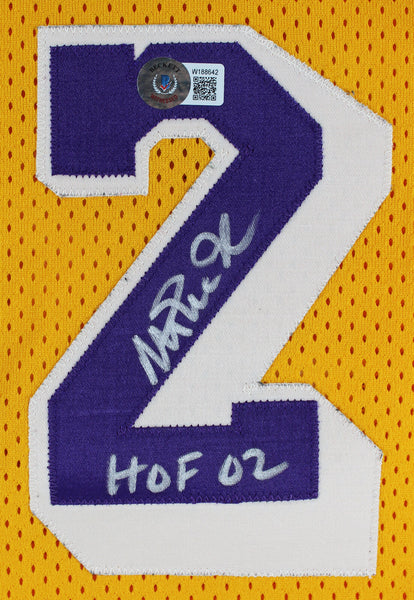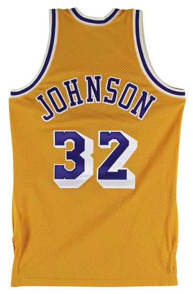 This Autographed Yellow Vintage MacGregor Sand-Knit Jersey with the inscription of "HOF 02" has been Personally Signed by Magic Johnson of the Los Angeles Lakers. This item is 100% Authentic to include a Certificate of Authenticity (COA) / hologram by Beckett Authentication Services. This is a BAS Witnessed Protection Program item which means a Beckett Authentication Service representative was present when this item was being signed. The authenticity can be verified on Beckett Authentication Services website. This is a Medium sized Jersey.