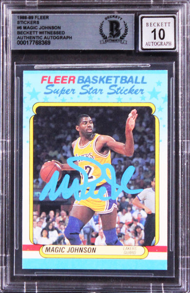 This Autographed Auto Graded Gem Mint 10! 1988 Fleer Stickers #6 Card has been Personally Signed by Magic Johnson of the Los Angeles Lakers. This item is 100% Authentic, it comes slabbed and authenticated by Beckett Authentication Services. We have multiples of this same item. While the photographs are representative of this item, the size and placement of the signature may vary. Each item is hand signed, therefore, each autograph is unique.