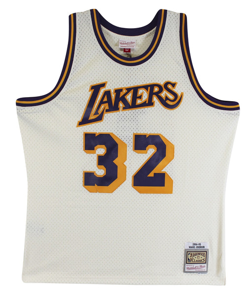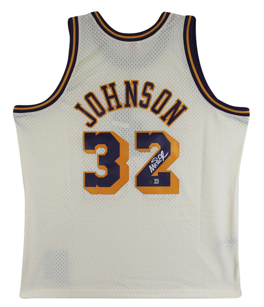 This Autographed Cream 1984-85 Mitchell & Ness Hardwood Classics Swingman Jersey has been Personally Signed by Magic Johnson of the Los Angeles Lakers. This item is 100% Authentic to include a hologram by Beckett Authentication Services. This item will come with an affixed Beckett Authentication Services (BAS) authentication sticker, which includes a scannable QR code to verify authenticity. Please note that Beckett no longer provides serial-numbered COA cards, and the attached BAS sticker will serve as the complete authentication for this item. This is a BAS Witnessed Protection Program item which means a Beckett Authentication Service representative was present when this item was being signed. We conducted an autograph signing with Magic Johnson where multiples of the same item were signed. While the photographs are representative of this item, the size, placement and strength of the signature may vary. Each item is hand signed, therefore, each autograph is unique. This item can be verified through BAS Witnessed. This is a X-Large sized Jersey.