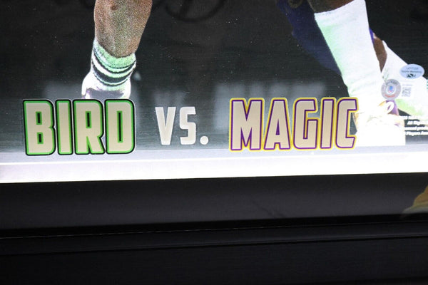 This autographed 16x20 photo features two of the greatest basketball players of all time, Larry Bird and Magic Johnson. The photo is an original, with authentication from Beckett Authentication Services (BAS). It is lit and comes with a shadowbox. The players are signed and the autograph is authenticated, making this a valuable addition to any sports memorabilia collection. The photo is from the Los Angeles Lakers and BostonCeltics, and is perfect for fans of the sport and collectors alike. Add this unique piece to your collection today.