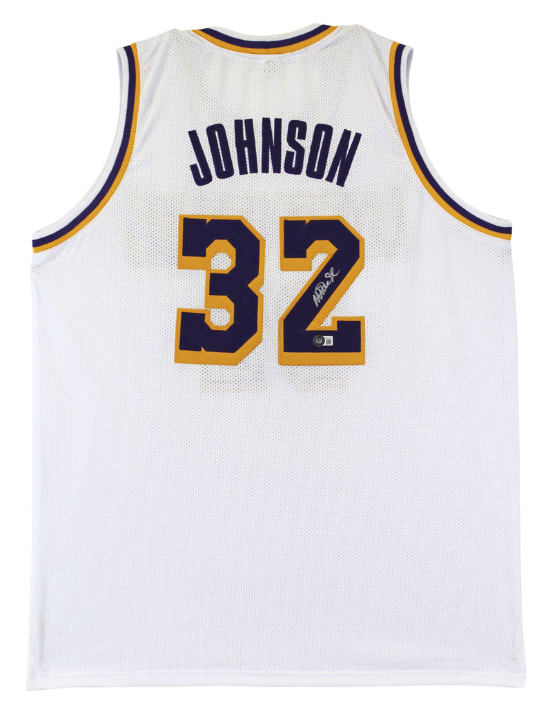 This Autographed White Jersey has been Personally Signed by Magic Johnson of the Los Angeles Lakers. This item is 100% Authentic to include a hologram by Beckett Authentication Services. This item may come with the new Beckett Authentication hologram that has a scannable QR code rather than the traditional COA. If you would like to have a COA, you are welcome to reach out to Beckett for a printed certification once you receive your item. This is a BAS Witnessed Protection Program item which means a Beckett Authentication Service representative was present when this item was being signed.. This is a stock item. We conducted an autograph signing with Magic Johnson and we have several of these available. The one you will receive will be of equal quality to the one pictured. This item can be verified through BAS Witnessed. This is a X-Large sized, non-branded, custom-stitched Jersey.