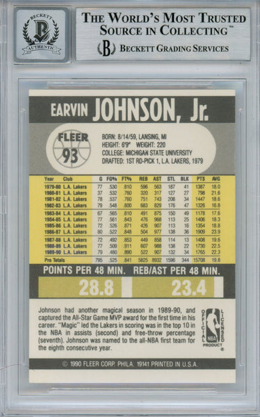 Magic Johnson Autographed 1990-91 Fleer #93 Trading Card Beckett 10 Slab 37818 The number in the listing title is just an inventory sku for our records and is not the authentication number. The item pictured is a stock photo unless otherwise noted. This is a 1990-91 Fleer trading card that was personally autographed by Magic Johnson. This has been professionally slabbed by Beckett Authentication Services (BAS) and includes a certificate of authenticity from Denver Autographs.